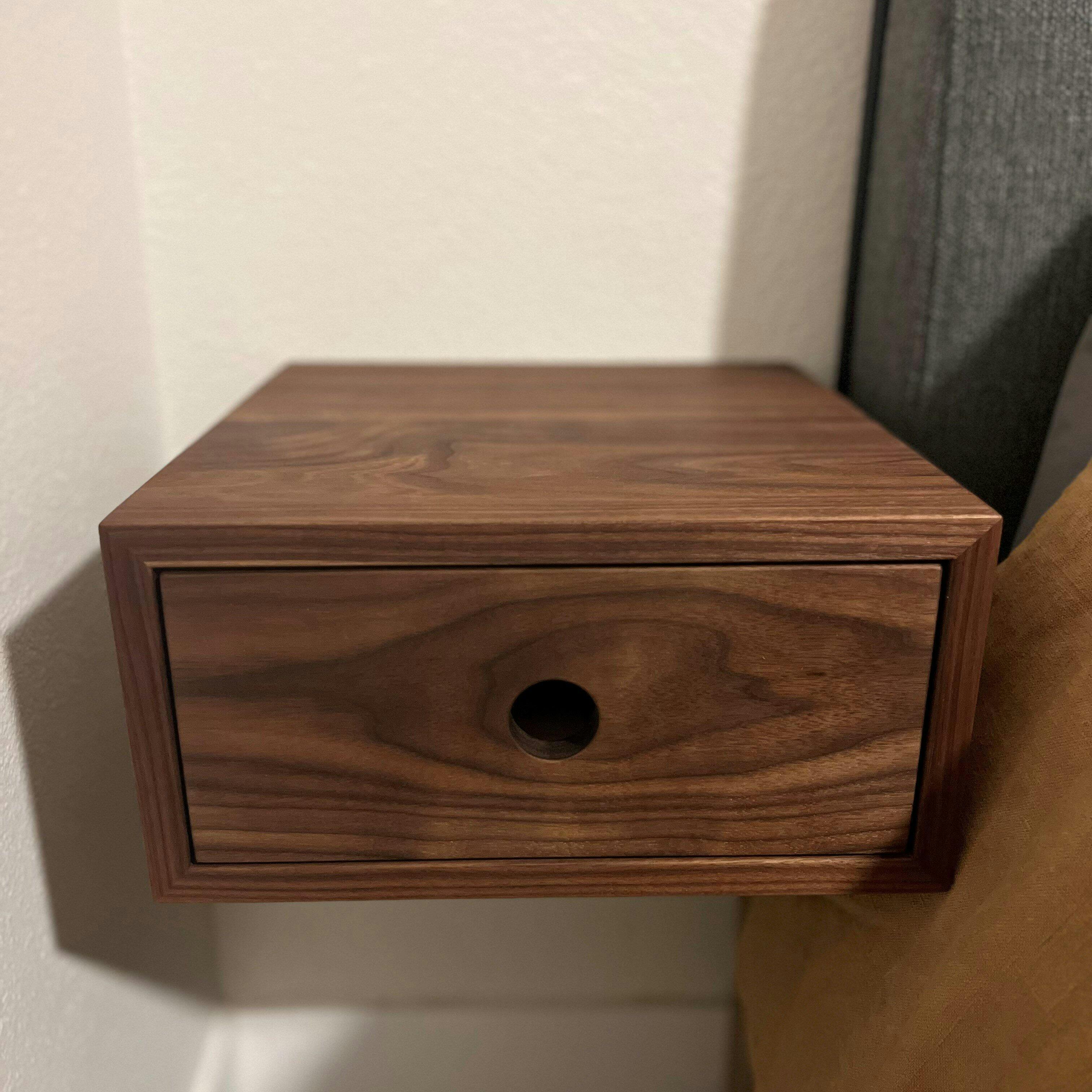 Theses floating nightstands are absolutely gorgeous. I ordered two double drawer nightstands in white oak. They are outstanding in quality and craftsmanship which is very important to me. I unfortunately have to wait for my husband to install the hardware I chose instead of the finger holes. At some point he will install the knobs and hang them for me. Fingers crossed it will be sooner than later lol!!