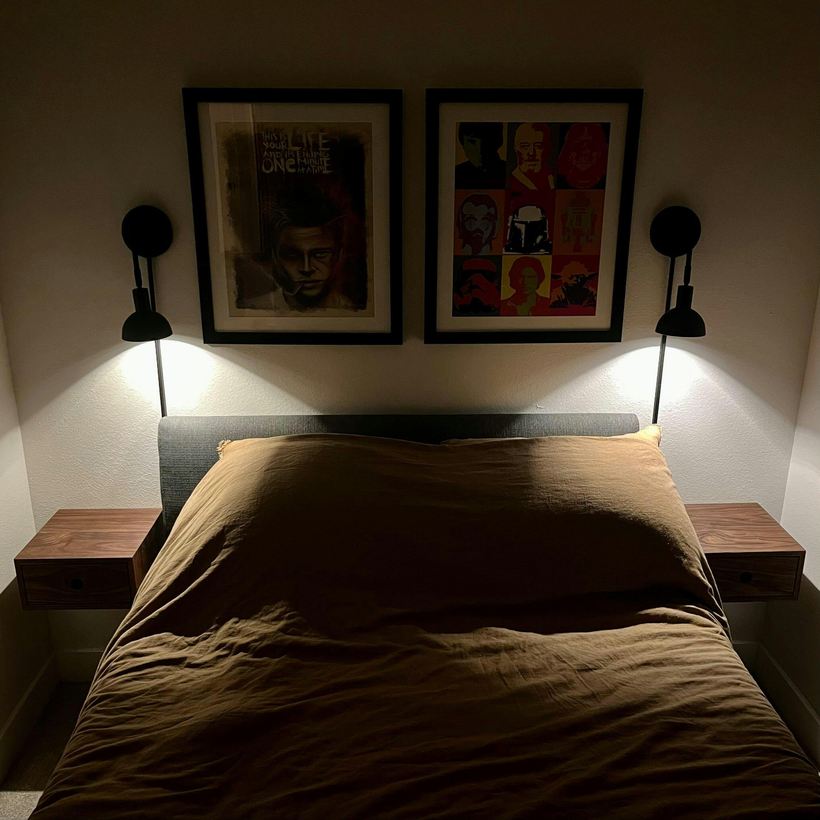 We searched around for two floating nightstands for quite a while. We found a bunch of small, cheap, minimal quality versions. Our usual quality furniture stores didn't really get what we were looking for - we thought floating nightstands were pretty mainstream, but we found out otherwise.