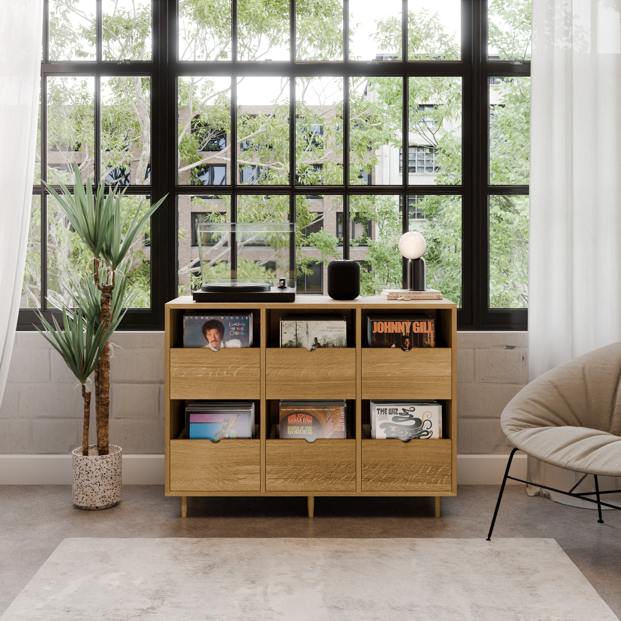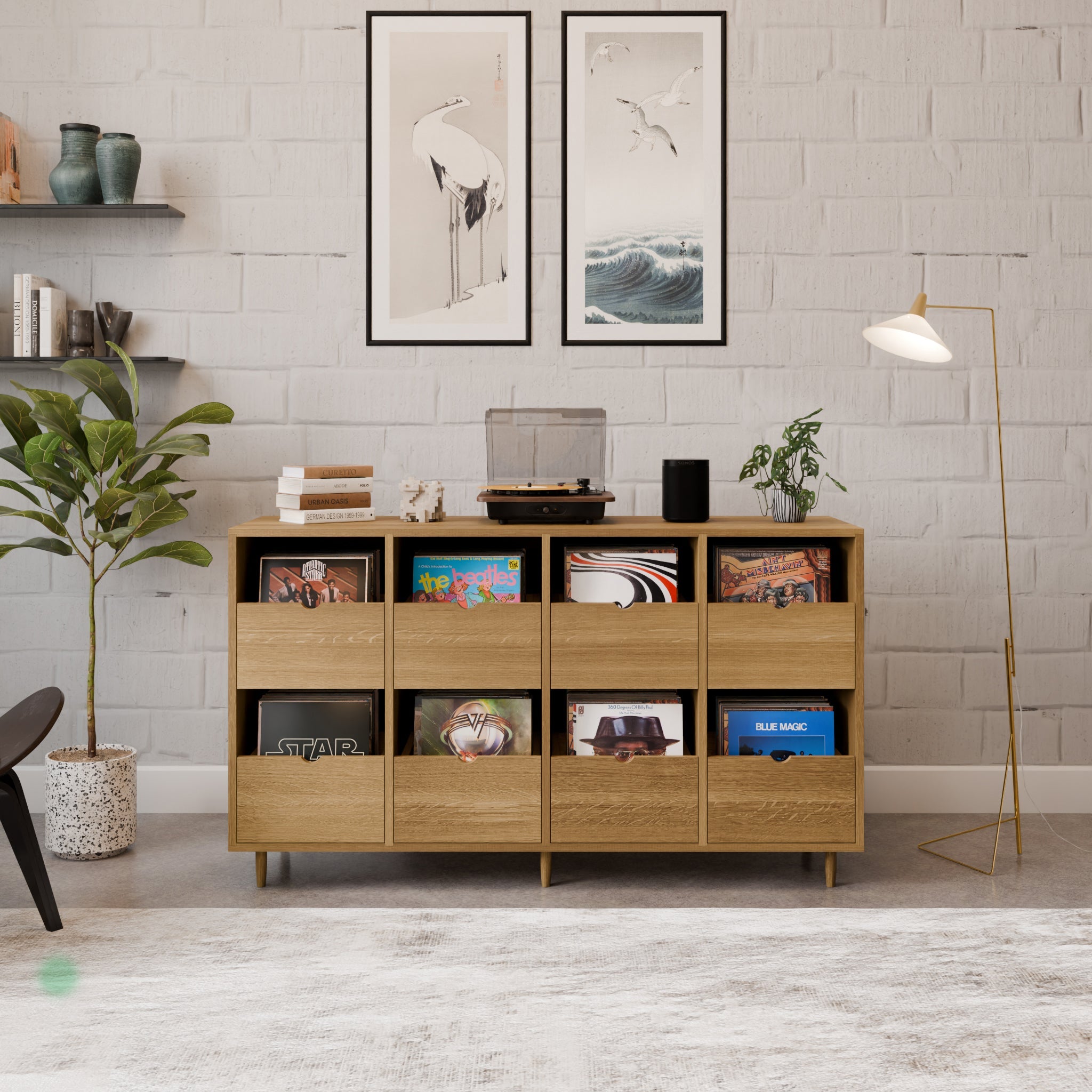 This premium Vinyl Credenza is handcrafted from solid White Oak with solid Maple soft-close drawers. Drawer slides are hidden under-mount and premium grade full extension. Drawer fronts are cut from a single Walnut plank showing continuous grain across the credenza.